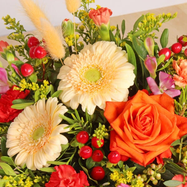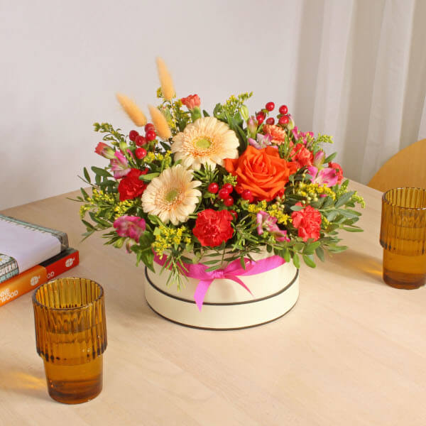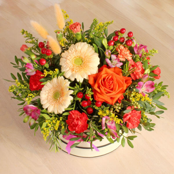 Our Brandy Snap Hatbox features nature's finest with vibrant Autumnal colours. This arrangement is the perfect centrepiece to add a delightful floral touch to your office, kitchen or any interior.