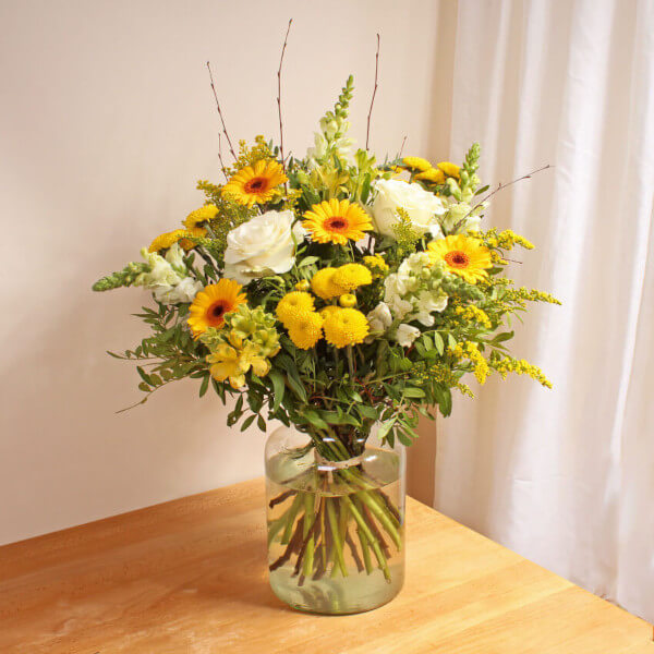 Note: Vase not included. Featuring a stunning combination of Antirhinum, Craspedia, Germini and Roses each Lemon Sizzle bouquet is hand tied by local florists and is a zesty delight! This bouquet will be handcrafted by an experienced florist, order for same day delivery by hand, or next day delivery via our courier.