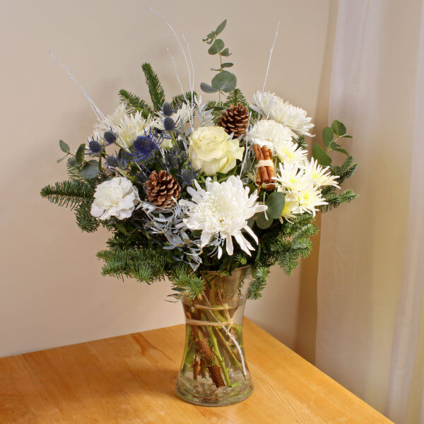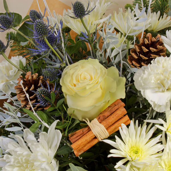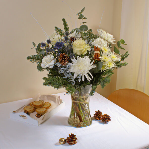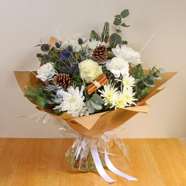 A combination of Chrysanthemum, Carnation and Roses, these hand cut white blooms are remeniscent of a White Christmas, and are the perfect seasonal flowers for chilly winter evenings. Handcrafted using ethically sourced, sustainable flowers.