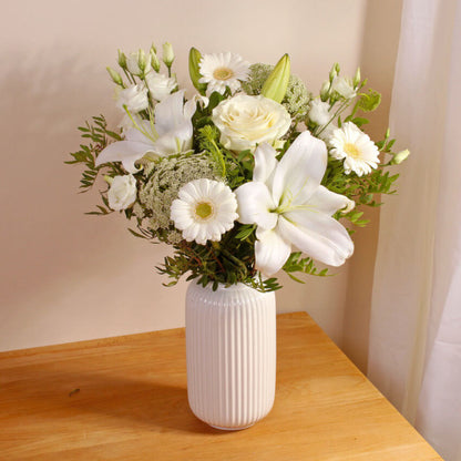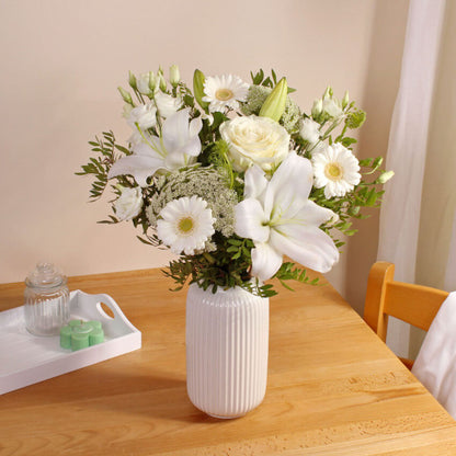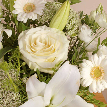 Note: Vase not included. Celebrate any occasion with our elegant yet understated bouquet featuring pristine white Lilies and Roses, meticulously arranged to convey timeless grace and beauty. Hand created by our skilled local florists, you can buy this exquisite arrangement online and have the flowers delivered to your doorstep or directly to your loved ones. Perfect for Easter March 31st 2024 or any special moment, this stunning bouquet is sure to evoke joy and appreciation