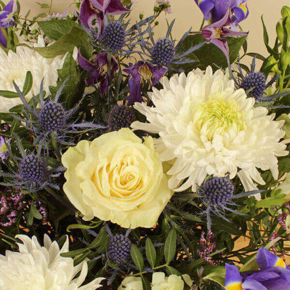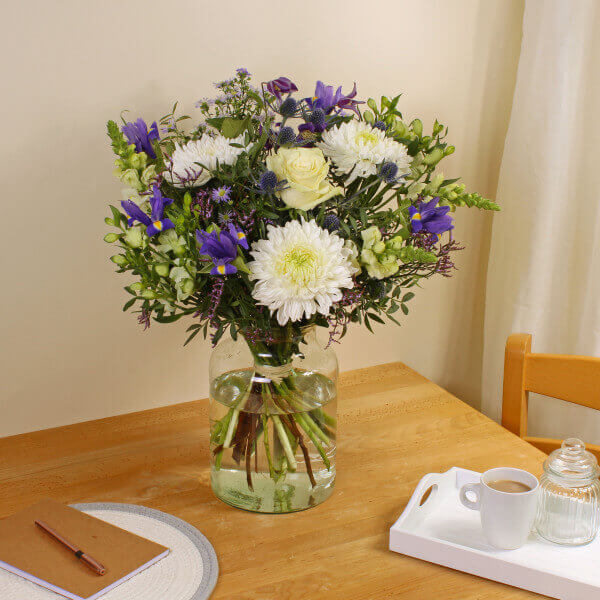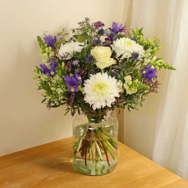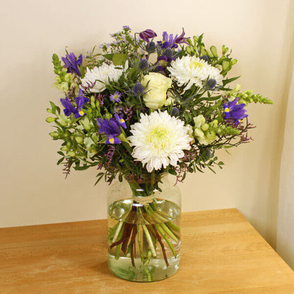 Note: Vase not included. Elegant and eye catching, this bouquet of hand cut flowers features Iris, Chrysanthemum and Lisianthus in vibrant colours. The ideal gift for a loved one on any occasion, our flowers are ethically sourced and sustainable. This bouquet will be handcrafted by an experienced florist, order for same day delivery by hand, or next day delivery via our courier.