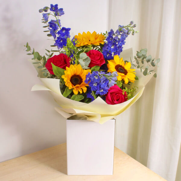 Capture the essence of summer with our radiant Summer Wonder bouquet, a vibrant celebration of the season’s most captivating blooms. This stunning arrangement features the cheerful glow of sunflowers, perfectly complemented by the towering elegance of delphinium. The rich, cerise roses add a touch of bold colour, while the delicate bupleurum and aromatic eucalyptus provide a refreshing finish.
