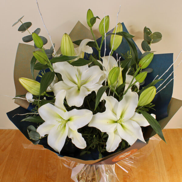 Note: Vase not included. A simple and clean bouquet, these hand cut blooms are a prime example of seasonal flowers. Our white lilies are the best quality, and picked to last.